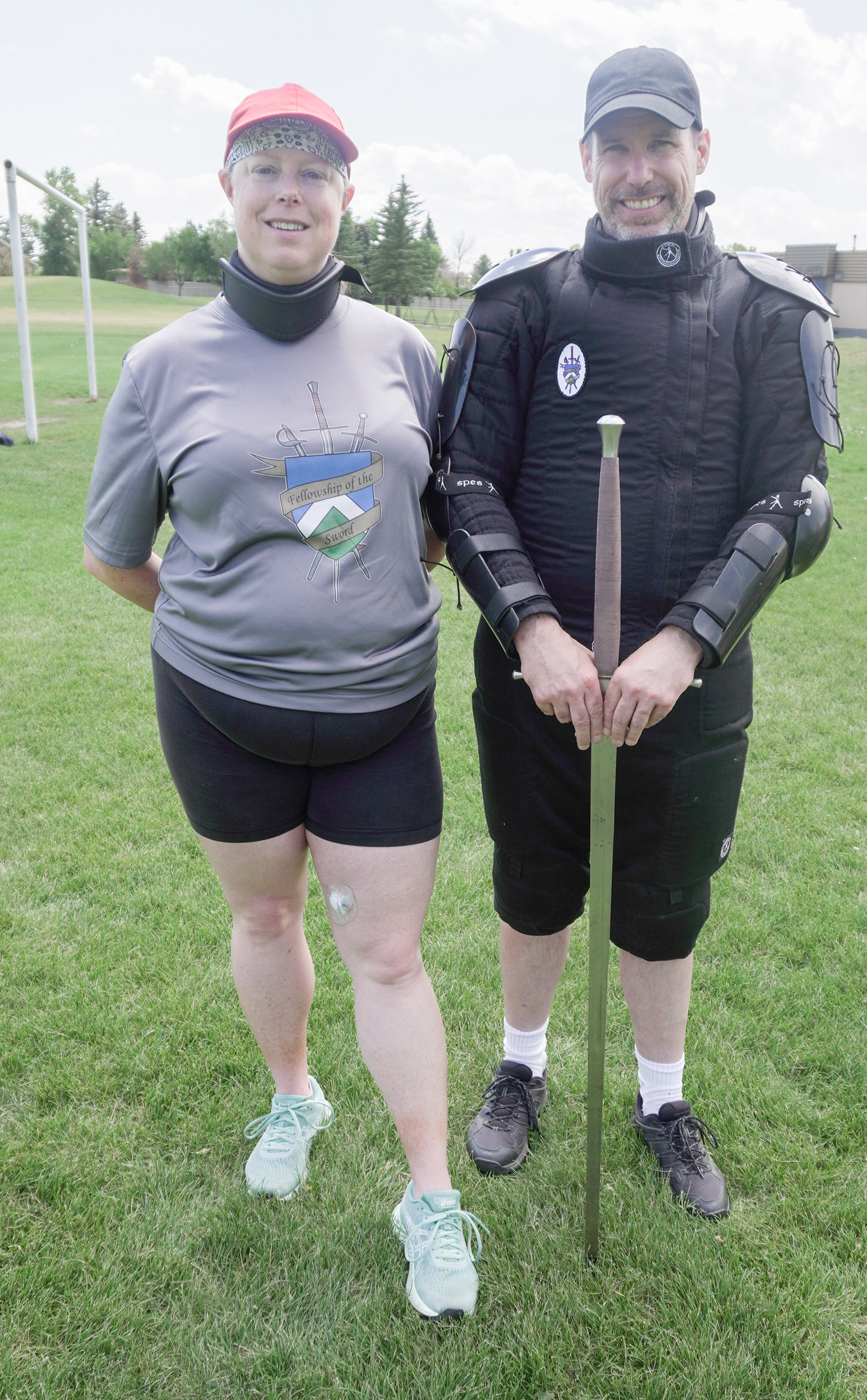 David Cranswick (foreground) relaxes with his synthetic longsword as he listens to David Lawless (background)