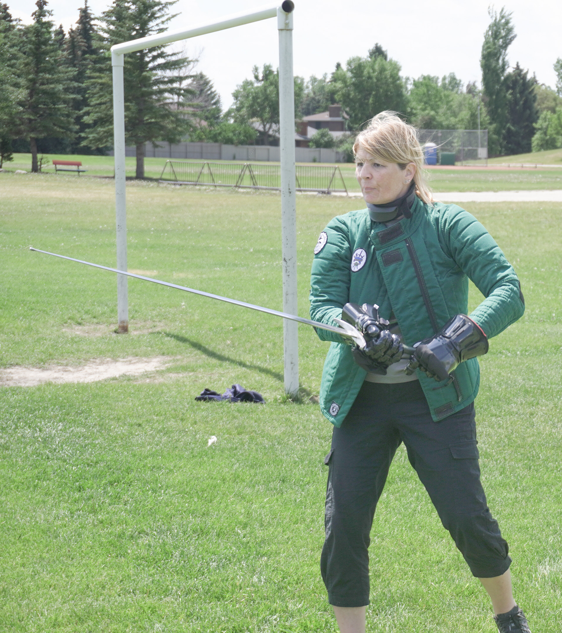 Lauren Shaw sports her teal green HEMA jacket while handling her steel longsword.