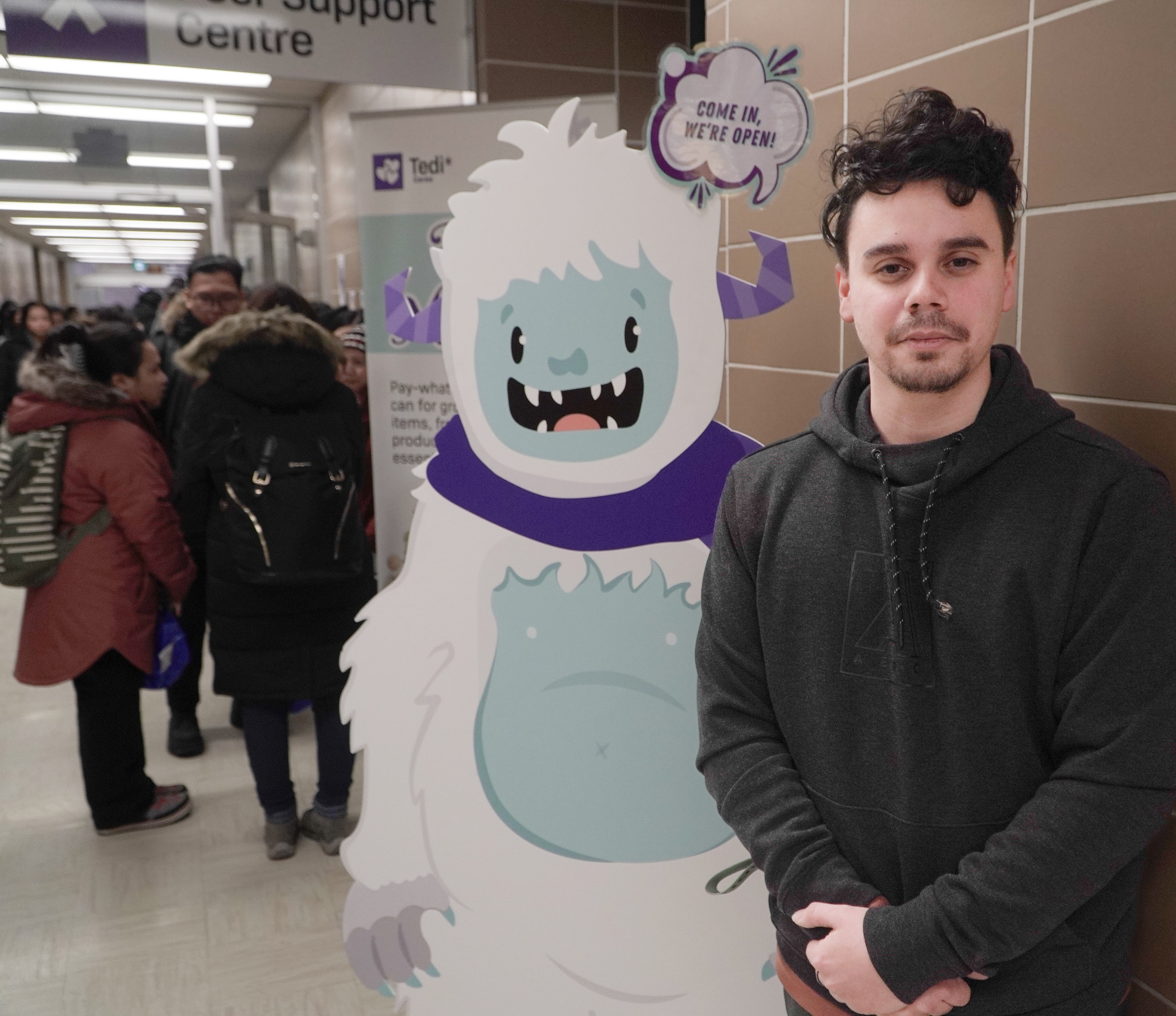 Jose Sandoval, assistant manager of student experience at SAITSA, stands outside the Peer Support Centre next to a Tedi display on SAIT Campus.