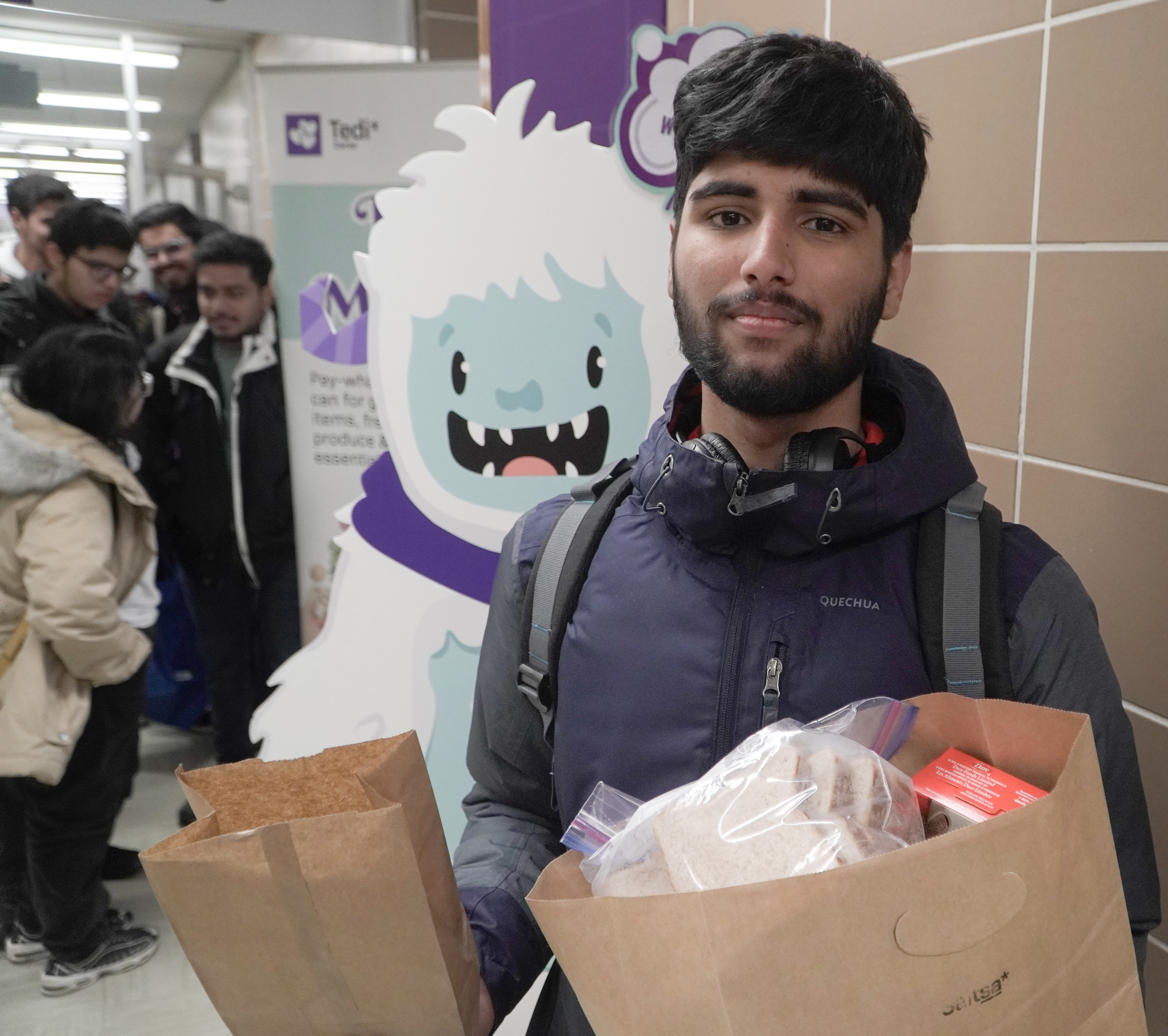 Princedeep Singh, a software development diploma student stands with his groceries from the Tedi Market outside the Peer Support Centre on SAIT Campus.